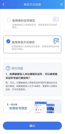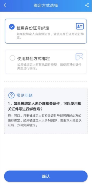 步骤2:请根据说明选择合适的绑定方式,然后点击【确认】按钮。仔细阅读告知书文字,按照要求填写信息,上传相关材料,完成绑定。